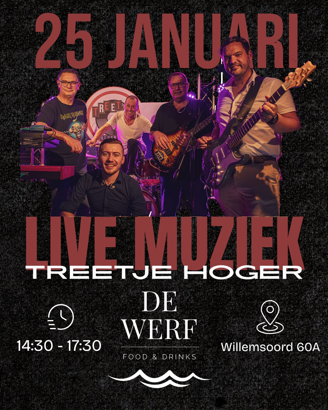 Iedere tweede en laatste zondag van de maand treden de leukste en sfeervolste bands uit Den Helder op bij de Werf even de week goed afsluiten van half drie tot half 6 klinkt de muziek en hierna gaan we over in het diner, ideaal voor een dagje uit in eigen stad!